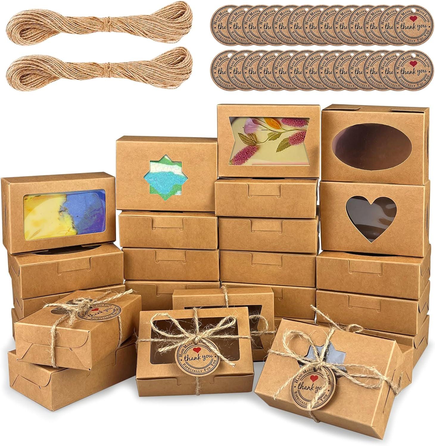 These 25pcs kraft soap boxes with a transparent window are perfect for showcasing your homemade soaps, bakery treats, candies, or cookies. Made from durable, eco-friendly kraft paper, they provide a stylish and rustic look while keeping your products fresh and protected. The small size is ideal for gifting or packaging homemade creations, making them a versatile choice for any small business or DIY project.